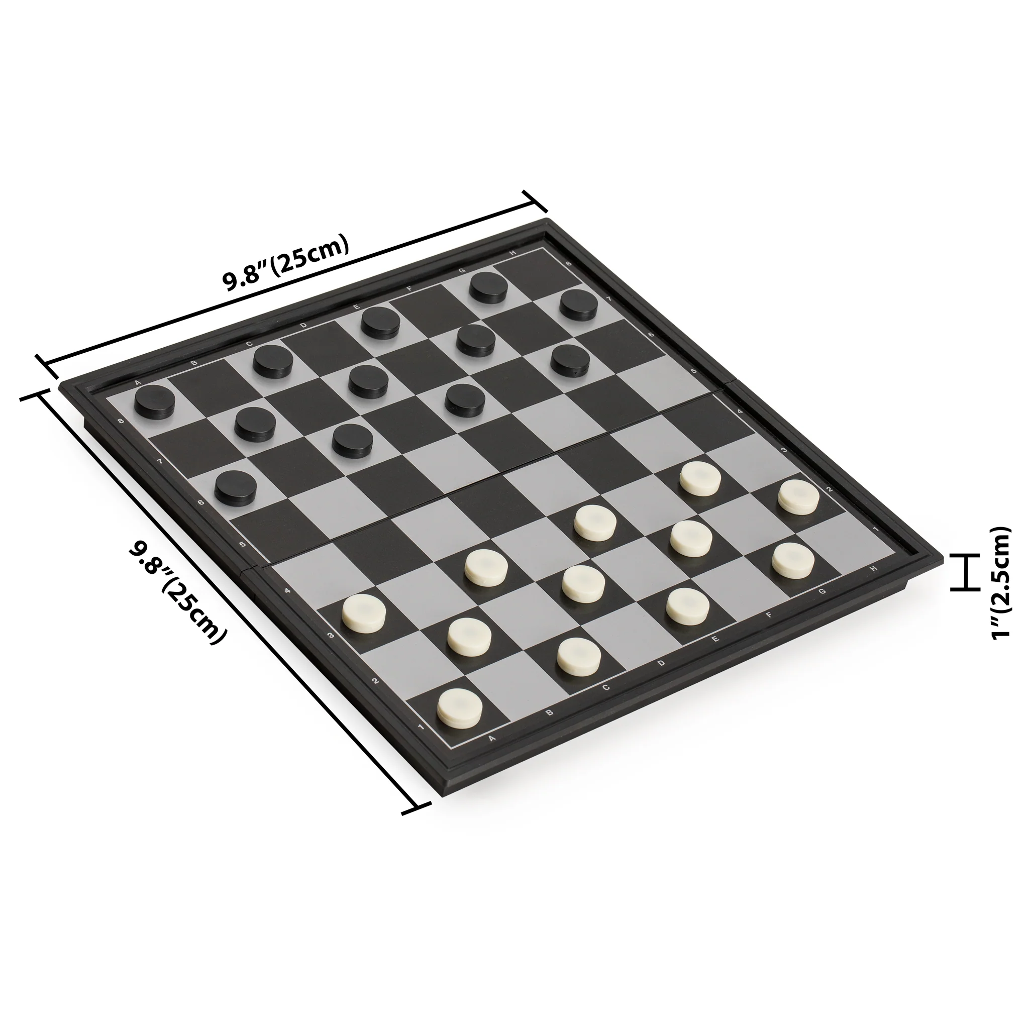 - Portable 3-In-1 Set: Play chess, checkers, and backgammon wherever you go with this handy multi-game set; The double-sided board measures 9.8 x 9.8 x 1 inch (25 x 25 x 2.5 centimeters) when open